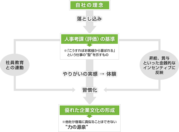 これがないと社員は判断に迷うこととなります。どんな会社にも実際には自然に形成された風土、社風が存在しますので、明文化されたものがなくても社員は自然とこの基準に則った判断、行動をしています。しかし、風土、社風には「固い」「ゆるい」があり、また自然にまかせていてはどうしても「楽な方へ楽な方へ」と崩れていきます。
