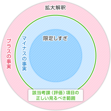 上記の図ではどちらの場合も正しい解釈の方が考課(評価)が低くなりますが、実際の場面では「高く考課(評価)すべきところを低く考課(評価)しすぎている」という逆も当然起こります。