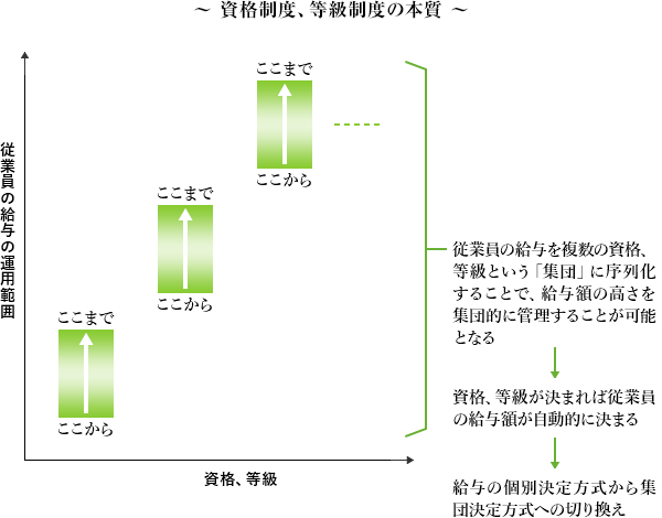 2025年6月号で述べたとおり、資格制度、等級制度とは、従業員の給与を低いところから高いところへ向かって複数の「集団」に序列化したものです。