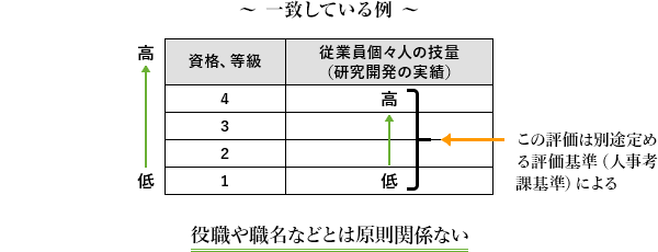 また、研究開発型の企業のように役職が多くない、いわゆるフラットな組織の会社では、従業員個々人の技量(研究開発の実績)をもって給与の序列を決定したい、というところもあります。このような会社では資格、等級の高さと技量(研究開発の実績)の高さが一致するように資格、等級制度の枠組みを決める必要があります。