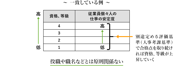 さらに、仕事の習熟にそれほど長い時間を要しない業種や職種については、仕事の安定度をもって給与の序列を決定したい、という会社もあります。このような会社では、該当の職種については仕事の安定度に応じて資格や等級が上昇していくように資格制度、等級制度の枠組みを決める必要があります。