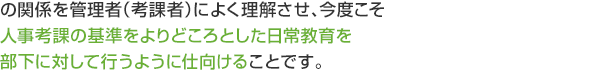 「順調にいっていない」場合には"考課がマンネリ化していないか"をまず確認する必要があります。社員一人ひとりの考課結果を数年分並べてみたときに、毎年同じような考課、同じようなコメントが書かれている、という場合がまさに"考課がマンネリ化している"状態です。これでは考課を通じた人材育成が期待できるはずもありません。"考課がマンネリ化している"要因としては様々なものが考えられますが、数年間にわたってほぼ固定化してしまっている状況を考課者研修等を通じて改善するのはほぼ不可能といってよいでしょう。このような場合には原点に立ち返って、「良い結果」を生む「正しいプロセス」はどのようなものなのかを深く考察するところから始め、その内容を人事考課の基準として定めるところから再出発した方が近道です。そして大切なのは人事考課の基準を設定して終わり、ではなく、