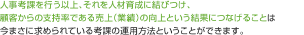 人事考課には通常莫大な労力が投入されています。近時のように昇給や賞与の原資そのものが小さく、考課結果による差がそもそもつけられないような場合に給料への反映だけを目的にした人事考課であればそれは大きなムダということになります。人事考課を行う以上、それを人材育成に結びつけ、顧客からの支持率である売上(業績)の向上という結果につなげることは今まさに求められている考課の運用方法ということができます。