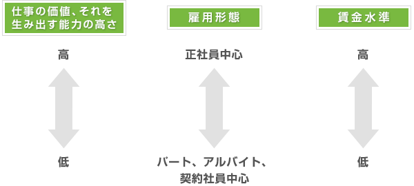 高付加価値の仕事やそれを生み出す能力というものは一朝一夕に育成できるものではありませんので、一度育てた社員は会社としても手放したくないと考えるのが当然です。これに対して補助的な仕事やマニュアルどおりに行うことが求められる仕事は短期間で人材を入れ替えても対処することが可能ですから、正社員である必要はありません。
