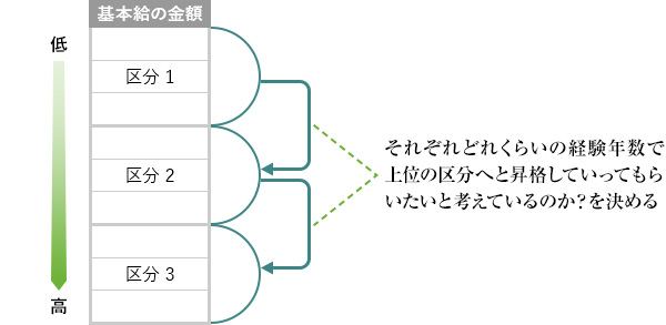 次にその区分を、会社としてはそれぞれどれくらいの経験年数で上位の区分へと昇格していってもらいたいと考えているのか?を決めます。
